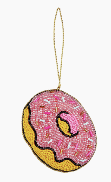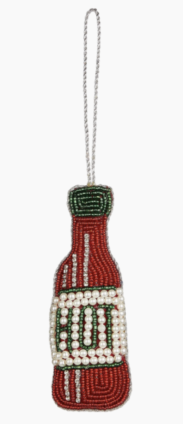 Celebrate the season with these adorable ornaments from Sudha Pennathur: beaded snowman ornament, beaded donut ornament, and a hot sauce ornament.