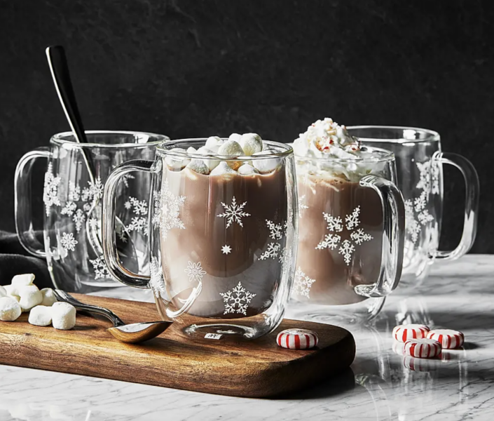 These festive holiday mugs from ZWILLING J.A. Henckels include four double-walled glass mugs with a snowflake design. Mugs are dishwasher, microwave, and freezer safe.